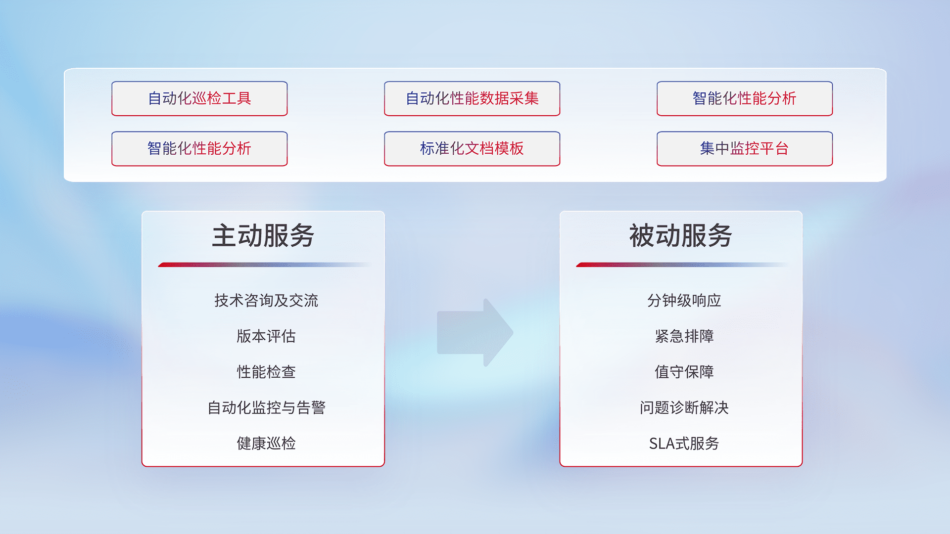 智能化工具和标准化文档,,,保障服务质量,,提供主动服务(包含技术咨询、、、版本评估、、、性能检查、、、自动化监控与告警、、、、健康巡检)和被动服务包含(分钟级响应、、、紧急排障、、、、值守保障、、、、问题诊断解决、、、、SLA服务)。。。